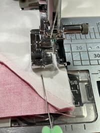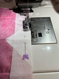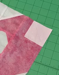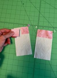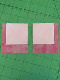 - Switch back to your open toe foot. With the two 3” by 3 ½” pink rectangles facing up, place a white 2 ½” square on the top inner corner of each rectangle with the marked diagonal facing up.