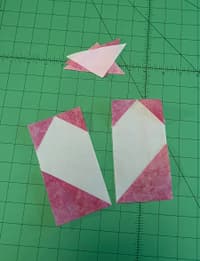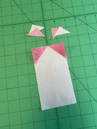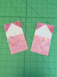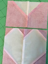 - In the same way, sew one pink 3” square to the bottom of each white rectangle, but angle each the opposite way so they will form a “V” at the bottom when sewn together. Press and trim.