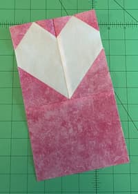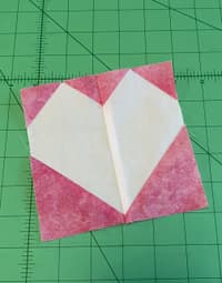 - Sew the remaining two white 2 1/2” squares to the top outer edges in diagonal seams to round the top of the big heart.
