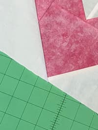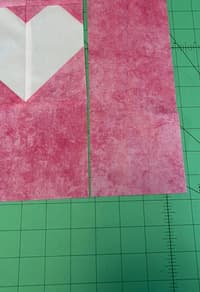 - Switch back to your open toe foot. Sew a white 6 1/2” square on the bottom corner of one of the pink side pieces with the diagonal marks facing up. Sew a diagonal seam. Press and trim. Do the same with the other white 6 1/2” square to make the bottom “V” of the heart. The point of the pink “V” will have some extra white fabric beyond it