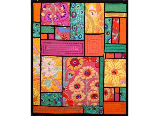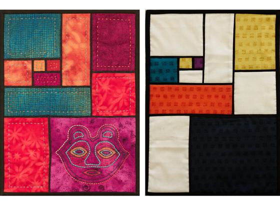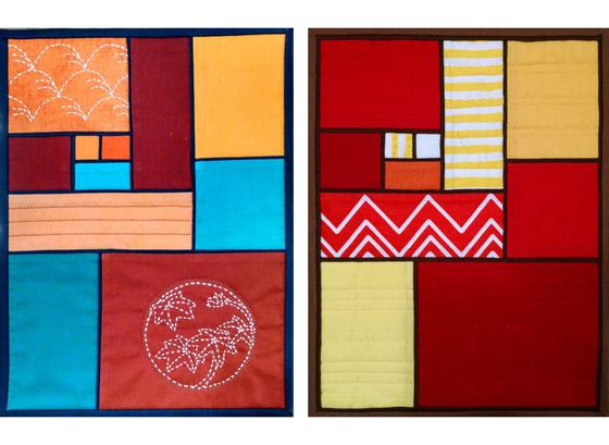 Flat (un-stuffed) piping can be used to make narrow framing bands around the pieced blocks of a quilt. The advantages of flat piping over stuffed is that it can be added with a standard presser foot, filled piping is trickier to apply and must be sewn on with a zipper foot. In this project you will learn the basics of flat piping to create modern abstract compositions after the style of Dutch artist Piet Mondrian who is most often recognized for his paintings of simple geometric squares and rectangles outlined in thin black lines. This flat piping is a perfect technique to create those thin even dividing lines. The fabrics you choose can be plain solid colors in homage to Mondrian, or go for a wild look with colorful prints or ethnic fabrics. You can also choose a single motif print to use as a focal square among a composition of solid colors. The finished project can be embellished if you wish and the geometric shapes are a perfect base to try out some Kantha or Sashiko style stitchery. The project you make in class will be small so you can finish the top in class but once learned, the technique can be used on larger quilts.