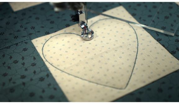 - When near the end, stop the machine, lift the presser foot and slide the ruler into position to continue stitching the design. When changing positions, stop the machine, and simply reposition the ruler and stitch in the direction needed to follow the ruler.