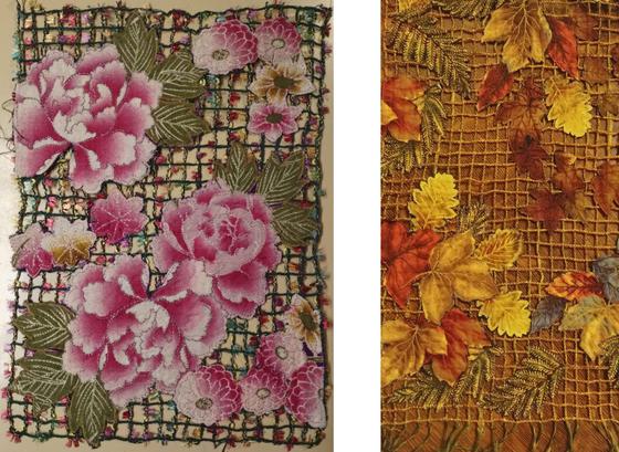 In this class you will make a panel of leafy or floral ‘lace’. Botanical motifs are layered and fused then fussy cut and stitched over a ground work of machine made lace composed from decorative yarns or cords. The resulting lace can be used as a table runner or mat – perfect for holidays if you choose appropriate fabric motifs, or you can work on a ground of thread-work without yarn to make a lacy scarf. For a first time project, I recommend starting with a smaller project in the class, creating the background mesh is time and labor intensive and you want to get to the stage of adding the botanical elements before the class is over, so a small table mat, or narrow scarf is advised. Once you have the process down, you can tackle larger projects.