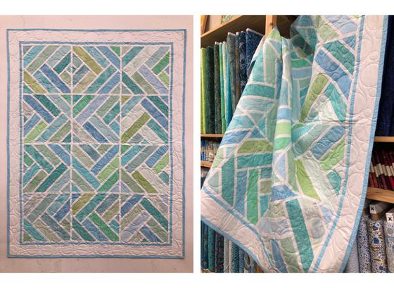 This quilt is beautiful in many color schemes. I’ve done it in peaceful sea glass tones but brights are beautiful as well. This quilt is scrap pile friendly if you prefer to go that route. While the piecing looks intricate, that is an illusion. The blocks are built from strip sets and straight-line piecing – no Y seams. Pattern & instructions will be provided in class. Piecing is very forgiving as we’ll create the blocks slightly large and trim to final size. This is a Beginner friendly class. Must know how to operate a sewing machine, use rotary cutter and ruler.