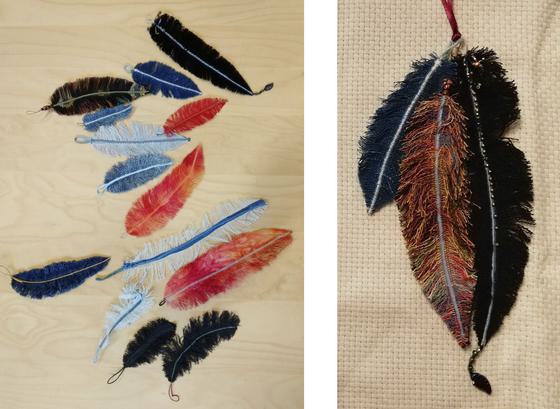 These ‘feathers’ are easy to make and amazingly realistic. You can make them from leftover scraps of denim or recycled worn out jeans; and some upholstery fabrics – particularly tapestry type – make gorgeous feathers as long as they are heavy enough and fray well. Your feathers can be used to embellish other projects or strung to make into jewelry, dangle from a purse or bag and even used as a unique scissors fob to identify your scissors at a class or workshop. You might even decide to ‘Feather Your Vest’!