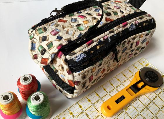 This class will run in two sessions, 4 hours each, scheduled 2 weeks apart to allow for homework. In the first session we will quilt (no quilting experience required) & cut out pieces, prepare binding and assemble the bag ends. In session two we will assemble pockets & flap, sew bag together and bind seams.