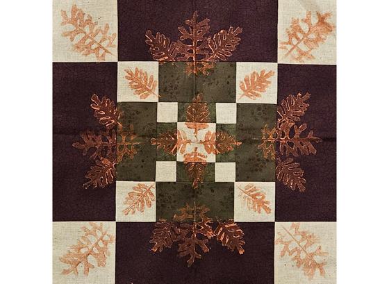 In this class you will make leaf prints applied to form decorative patterns on pieced blocks using textile paints. The prints can be made on raw fabric to be cut and assembled into a project, or you can pre-piece quilt blocks and apply the prints to them. Both options are detailed in the supply list. The finished block can be made into a pillow if you choose, or you can experiment with making leaf prints on exotic art papers if Mixed Media Fiber Art appeals to you. The class fee includes use of instructor's textile paints.
