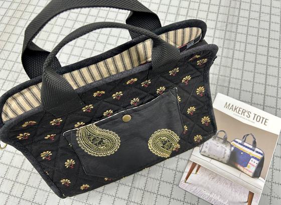 MAKER’S TOTE: Designed with handy on-the-go storage in mind. The outside of the bag features a patch pocket on one side and a zippered pocket on the other side. The interior has an optional zippered closure and four pleated slip pockets. The seams on the outside of the bag are all encased with bias binding.