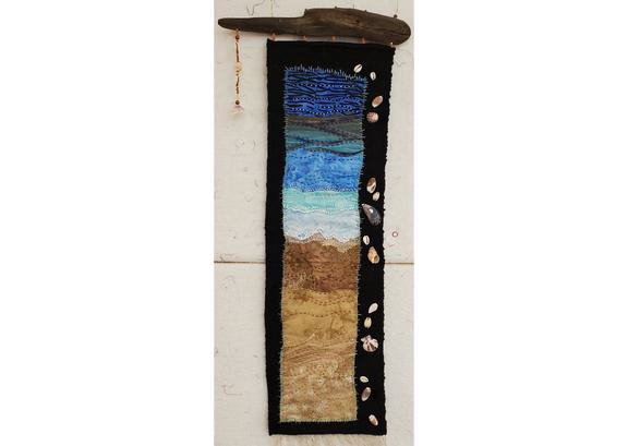 Use decorative Slow Stitching by hand or decorative machine stitches to create a unique piece of textile art by securing raw fabric strips to a background panel. For this project, you will select a series of fabrics that will be stitched to a foundation in a progressive sequence. The sample, as shown, represents the tide line of a beach as seen from above. You can choose a representational theme or choose a simple sequence of transitioning colors, values, or textures. This is a wonderful exercise in working with a gradation theme and a great opportunity to try out a variety of hand or machine stitches to enhance your project.
