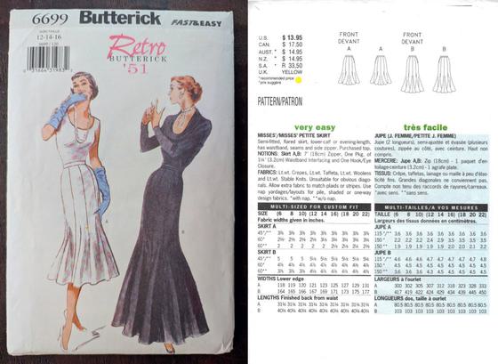 I’m excited to offer this Butterick 6699 – Retro Flared Skirt class. I was too young to make it when the 1951 version came out, but I’ve been making this classic versatile skirt since this retro pattern was issued in 2000. I have never actually made the skirt in the mid-calf or long evening length, but I have used made shorter versions, just above or below knee length with a higher flare at least 30 times in since it came out in 2000. This is my all-time favorite skirt pattern and can be constructed using just about any type of fabric. I’ve made it with wool, quilting cottons, denim, canvas, twill, satin, taffeta, crepe, rayon challis, linen and more in various versions.