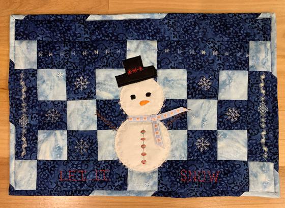 - Fat quarters of light and dark blue, scraps of white and black (for snowman)