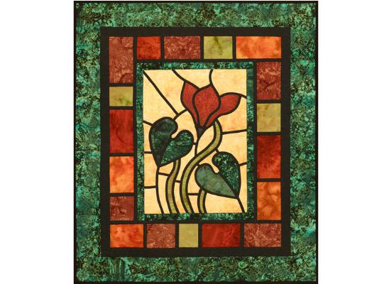 These elegant quilts celebrate the beauty of Stained Glass at a fraction of the cost. Narrow bias tape outlines and separates simple shapes cut and fused from bright fabrics to create Art Nouveau style botanical designs. There area few different flower designs to choose from – a Cyclamen, an Iris, and a Peony. If you choose batiks in luminous colors that ‘glow’, they look almost like real glass.