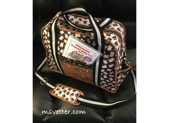 The Ultimate Travel Bag pattern designed ByAnnie. The perfect travel companion, this functional bag includes a comfortable padded adjustable carrying handy strap across the back to help secure the bag to rolling luggage. With a zippered and slip pockets on the front, back, and ends as well as a full zippered mesh pocket and three more slip pockets inside, the bag will keep everything organized and close at hand. This quilted bag measures 18 ½” L x 13 ¾”H x 8” D, large enough & strong enough to carry a small sewing machine.