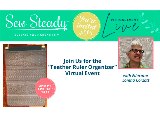 “Dive Deeper into Ruler Work” with Lorena Corzatt showing off how to create amazing feather designs on a homemade ruler organizer using Sew Steady & Westalee Design templates and tools. You will get a Pattern digital download and have a chance to Win Prizes, Get Event Special Pricing, and Learn!! Class fee is $10, but it includes the $8 pattern!