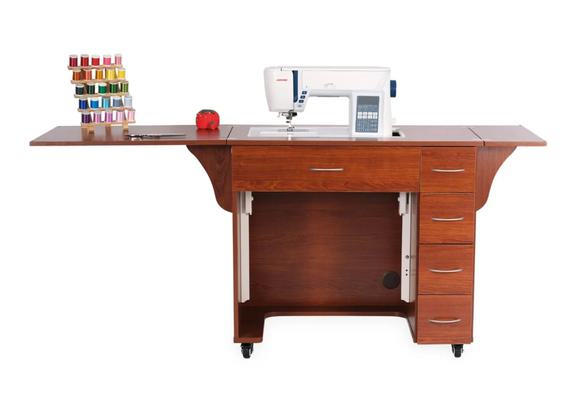 Alice Sewing Cabinet is a compact, mid-size sewing cabinet, designed with an ultra home-friendly footprint for your growing sewing studio! Alice features a convenient 3-position hydraulic sewing lift for free arm and flat bed sewing, 4 drawers to store notions and sewing accessories, 2 side leaves to expand your work surface, and sits on heavy-duty locking casters for stability and easy mobility!