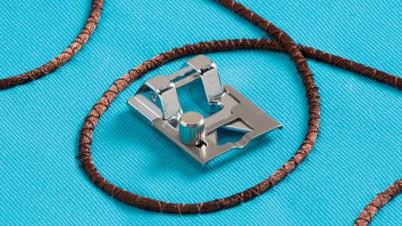 Used for both couching and stitching, this braiding foot is adjustable, which allows for greater flexibility in the width of the braid, cord, ribbon or elastic being applied.