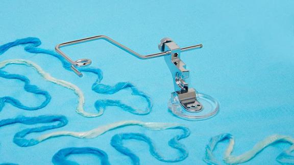 Easily embellish projects with decorative yarns using the Baby Lock Couching Foot. The guides hold your yarn, giving your hands more control for free-motion sewing.