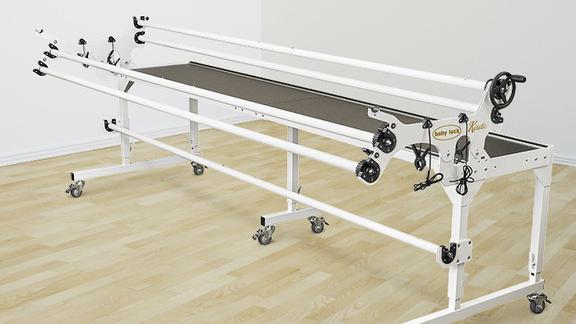 The Kinetic frame is a five-rail frame that can be set up at five or 10 feet long. The entire frame is made of solid-steel tubing, and the legs are adjustable, so the frame table height can sit anywhere from 33" to 44" tall. An optional 2' extension (Item #BLKF-EXT) is also available.