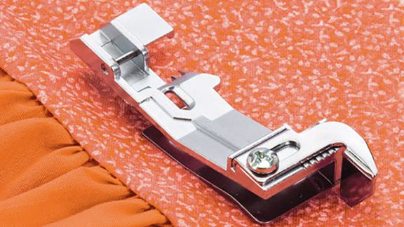 This serger foot is used for joining two pieces of fabric while ruffling the bottom layer in one easy operation.