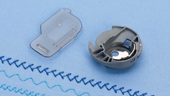 Achieve the look of textured stitches with ribbons or thick heavy thread using the Specialty Bobbin Work Accessory.
