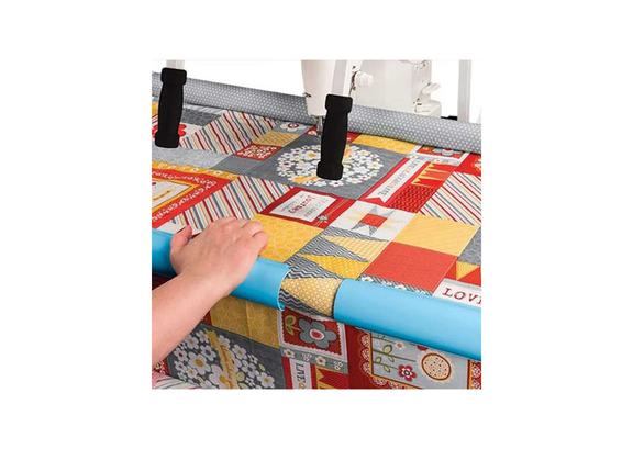 The Quilt Clips slide over your fabric and frame rail, keeping the quilt layers together. They expand to adjust to thickly rolled fabric and work for frames with rails of either 1½ or 2 inches diameter.