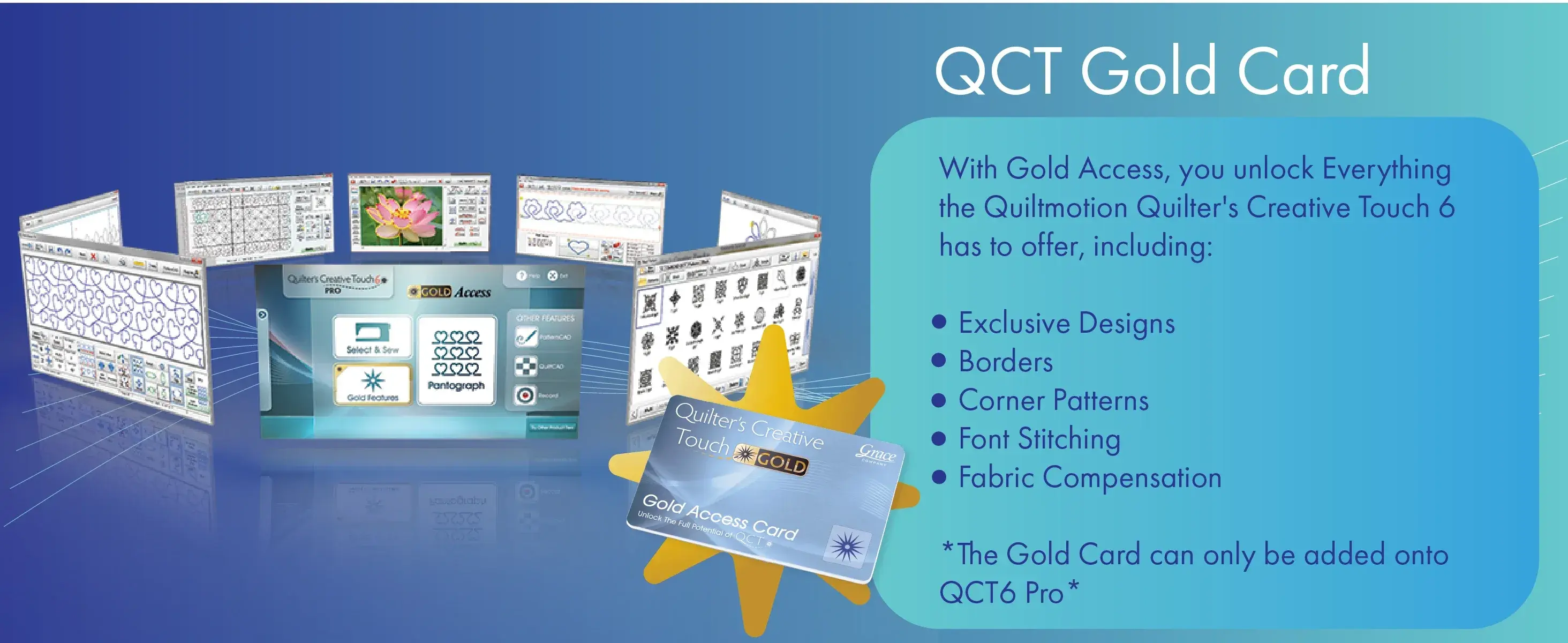 And if you purchase QCT6 PRO, you gain the option to purchase QCT Gold Access! Think of Gold Access as a key that unlocks additional benefits and powerful features beyond even the QCT6 Pro, with new exclusive creation tools and features. Get advanced control over pantographs, borders and corners, font stitching, and more!