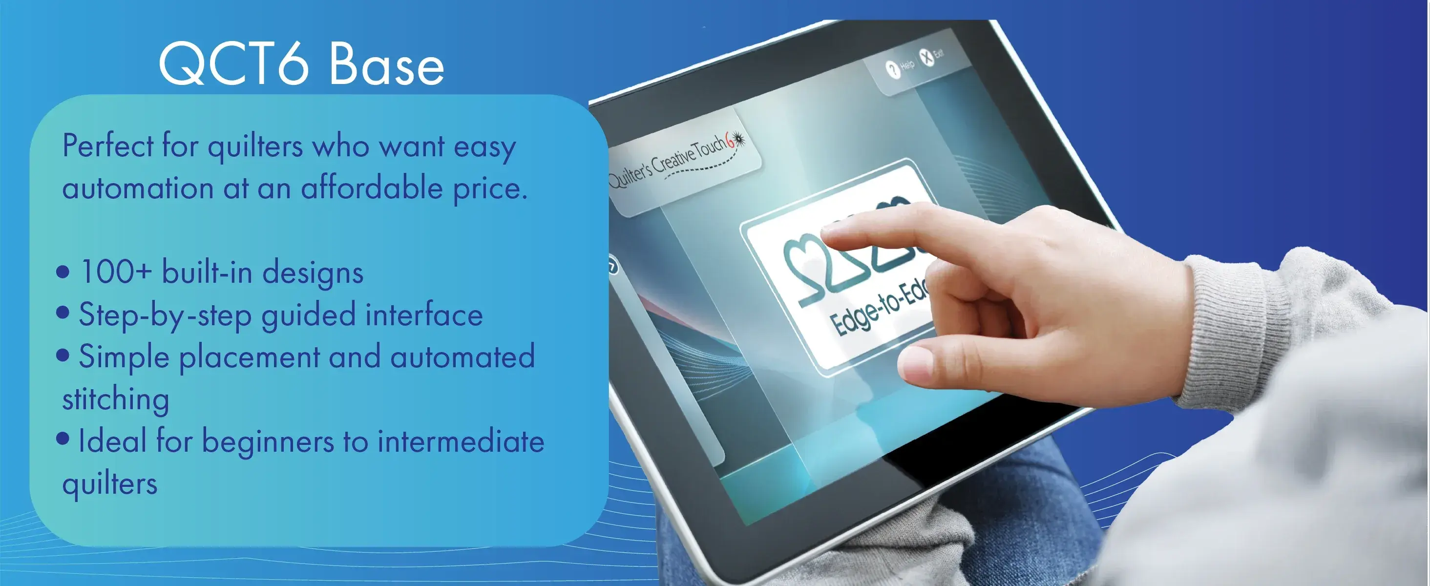 QCT6 offers all the essential features of computerized quilting at an affordable price point. Choose from over 100 stitch designs, place your starting point, and watch while your machine completes the stitching for you. You will never get lost with the full step by step guide and easy to use interface.
