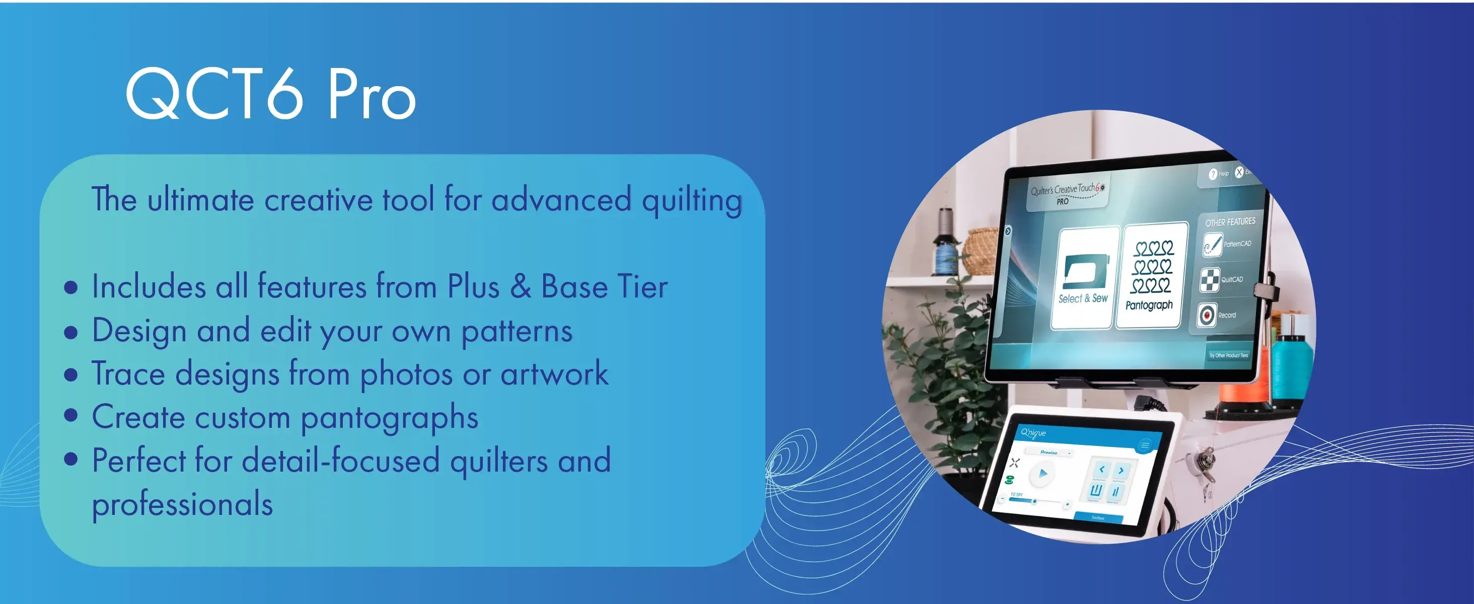 QCT6 Pro lets you design and edit any pattern, even trace them from your favorite photographs. Create simple or intricate pantographs, and so much more!