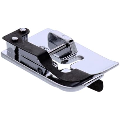 Blind hemming can sometimes be a little bit tricky so the blind hem foot goes some way to helping improve this technique. The foot has a metal guide in the center and three grooves on the underside. During blind hemming, the fold of the fabric fits snugly against the guide in the foot for accuracy wile the groove underneath help to prevent unnecessary slipping. The needle swings over the metal guide creating slack in the upper tension so that the pick of the stitch is almost invisible.