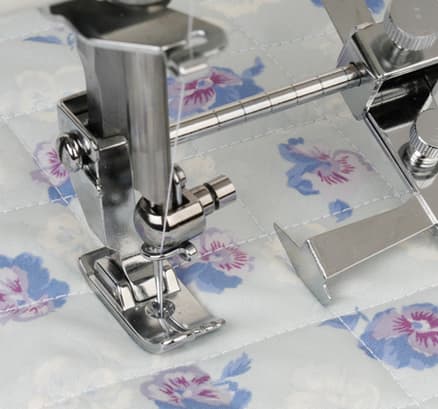 The Adjustable Seam Guide attaches around the presser foot shank and works with just about any presser foot. There are two adjustment screws so that you can slide the guide 1 1/2" to the right of the needle along the ruled bar for stitching along an edge or a previous row of stitching. What makes the Janome Adjustable Seam Guide unique is that you can also center the guide in front of the needle for perfect stitching in the ditch or bridging two fabric edges together. Think of all of the possibilities such as:
