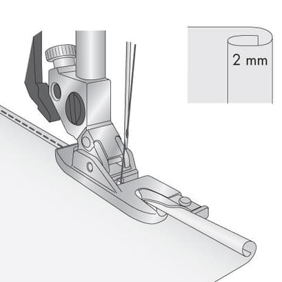TIP: Hem crisp fabrics with a straight stitch. Hem soft fabrics with a zigzag that just encases the mm size of the hem. (Sharply curved areas are not suitable for this type hemmer.)