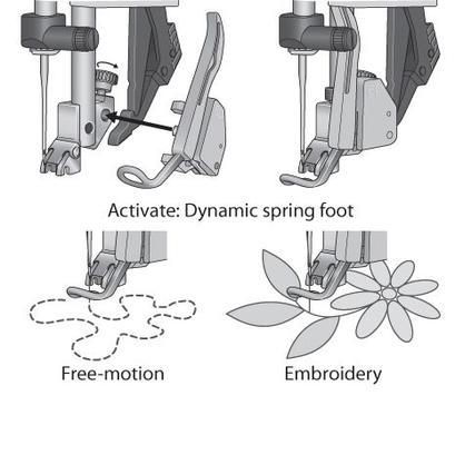 - Set the machine in the Dynamic Spring Foot 6D mode. The feed dogs will drop automatically.