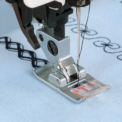 Create beautiful embellishments with the Fancy Stitch Foot. This foot has easily visible markings to help you position decorative stitches or borders on your fabric. A special groove on the bottom allows optimal feed of even the most densely stitched patterns.