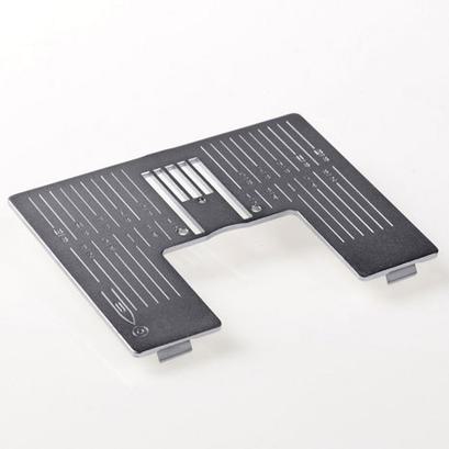 The Straight Stitch Needle Plate guarantees even fabric feed at the beginning and end of a seam, while preventing the fabric from being pulled into the needle plate.